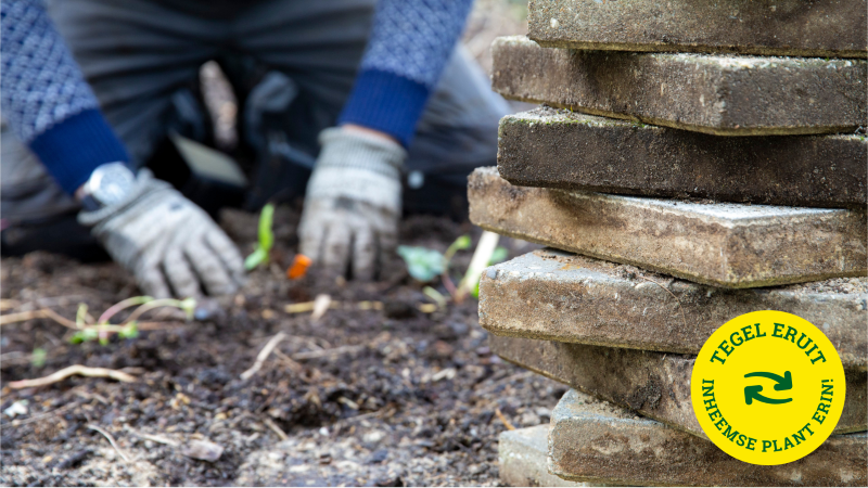 In een tuin met minder tegels en meer groen heb je minder wateroverlast en is het koeler in de zomer. Zo’n tuin is ook nog eens goed voor allerlei dieren, zoals insecten en vogels, én voor jou. Want onderzoek laat zien dat een groene omgeving een positief effect op je gezondheid heeft. Daarom geven we je graag 2 gratis tuinplanten. In ruil voor twee tegels. Op = op.